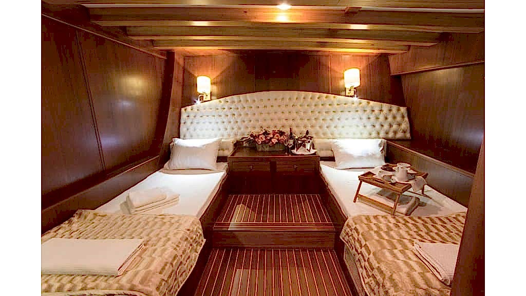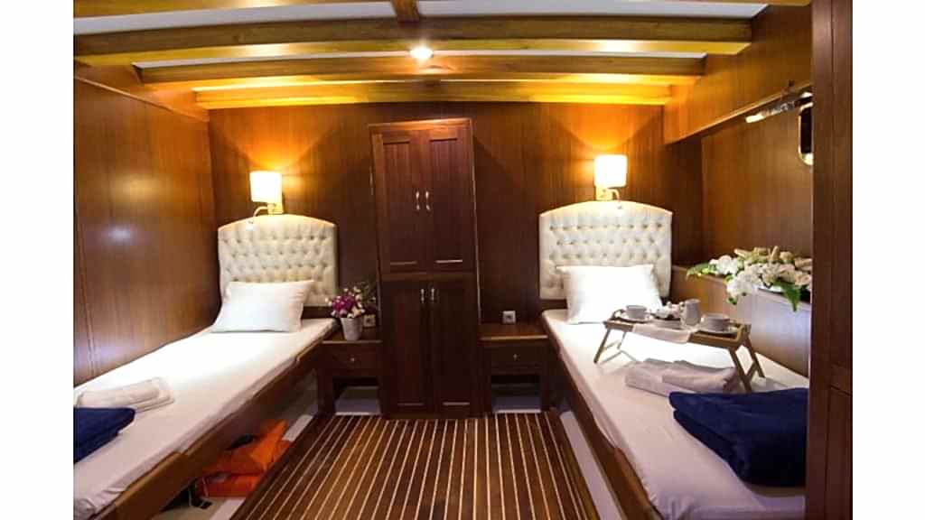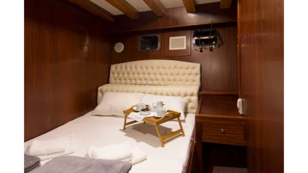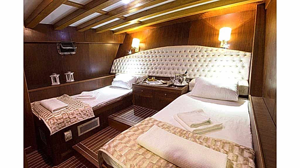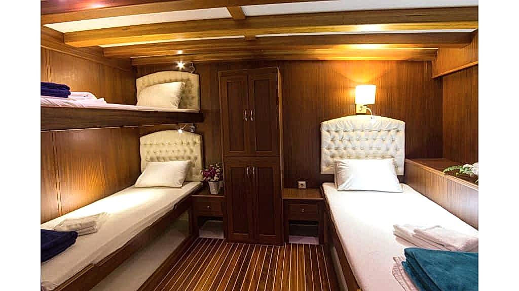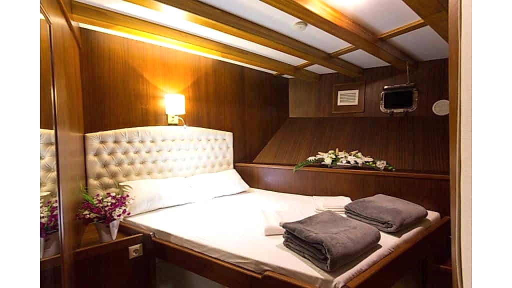 The “Boreas gulet” has 16 cabins (8 quat cabins, 4 double cabins, 1 triple cabin, 3 twin cabins) each more stylish and comfortable than the other, with its own shower, WC and air conditioning. Separate living areas for the crew, fully equipped kitchen, indoor and outdoor dining areas, relaxation areas and service bar are available. Boreas has enough sunbathing mats, chairs and service sets for all guests. In order not to be disconnected from the internet life during the holiday, we have wi-fi internet service valid within the borders of Turkish Waters on our boat. For the guests, optional water sports such as wakeboard, ringo, water ski are available.