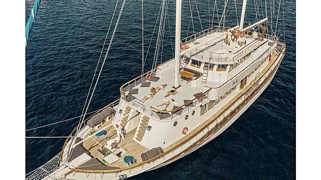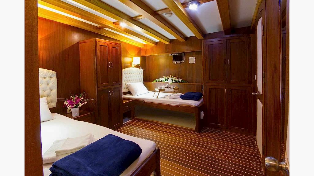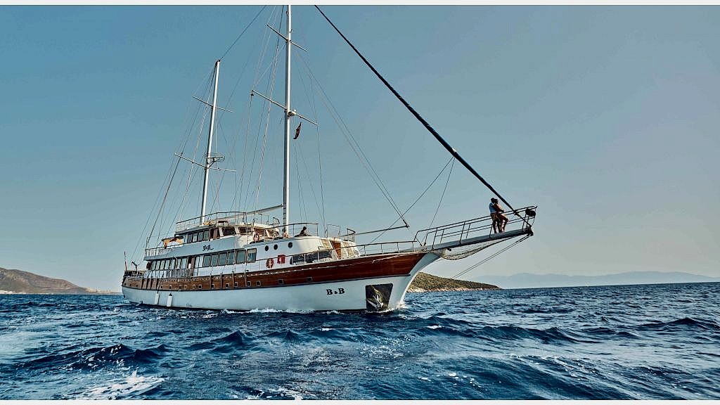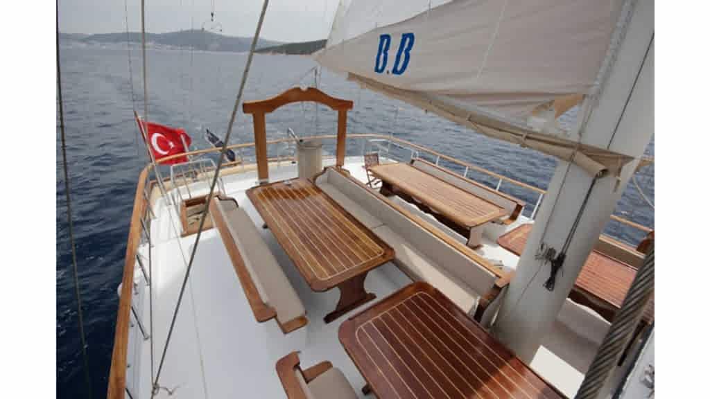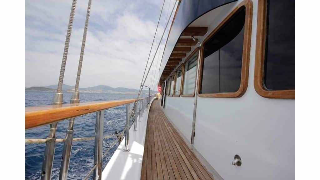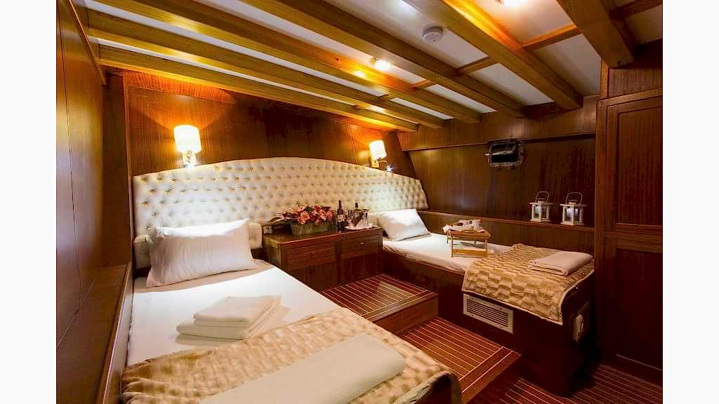 The “Boreas gulet” has 16 cabins (8 quat cabins, 4 double cabins, 1 triple cabin, 3 twin cabins) each more stylish and comfortable than the other, with its own shower, WC and air conditioning. Separate living areas for the crew, fully equipped kitchen, indoor and outdoor dining areas, relaxation areas and service bar are available. Boreas has enough sunbathing mats, chairs and service sets for all guests. In order not to be disconnected from the internet life during the holiday, we have wi-fi internet service valid within the borders of Turkish Waters on our boat. For the guests, optional water sports such as wakeboard, ringo, water ski are available.