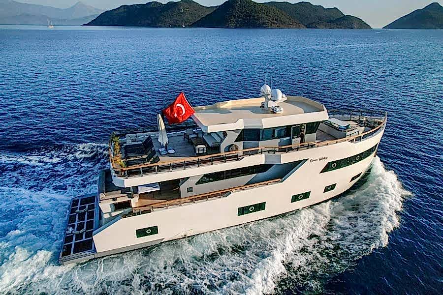 Step aboard the Cinar Yıldızı yacht, a stunning 30-meter yacht offering an unforgettable blue cruise experience along the Turkish Riviera. Built in 2023, the Cinar Yıldızı yacht is the epitome of elegance and sophistication. The yacht features five beautifully appointed cabins, accommodating up to 11 guests, with ample space and privacy for everyone. The vessel’s interior exudes luxury, and its expansive deck areas allow you to bask in the sunshine or enjoy the mesmerizing sea views.