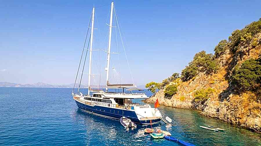 Sea holidays are wonderful with the 44-meter-long yacht Esma Sultan. You can have an unforgettable holiday experience with your family in the crystal-cool waters of the Aegean Sea. Esma Sultan, in her renewed state, serves our guests who are looking for a luxury holiday. Spacious and comfortable cabins, every detail has been considered for the comfort of the guests. All-day air conditioning and crew service provide you with new reasons for a beautiful holiday in the beautiful nature of the Mediterranean.
