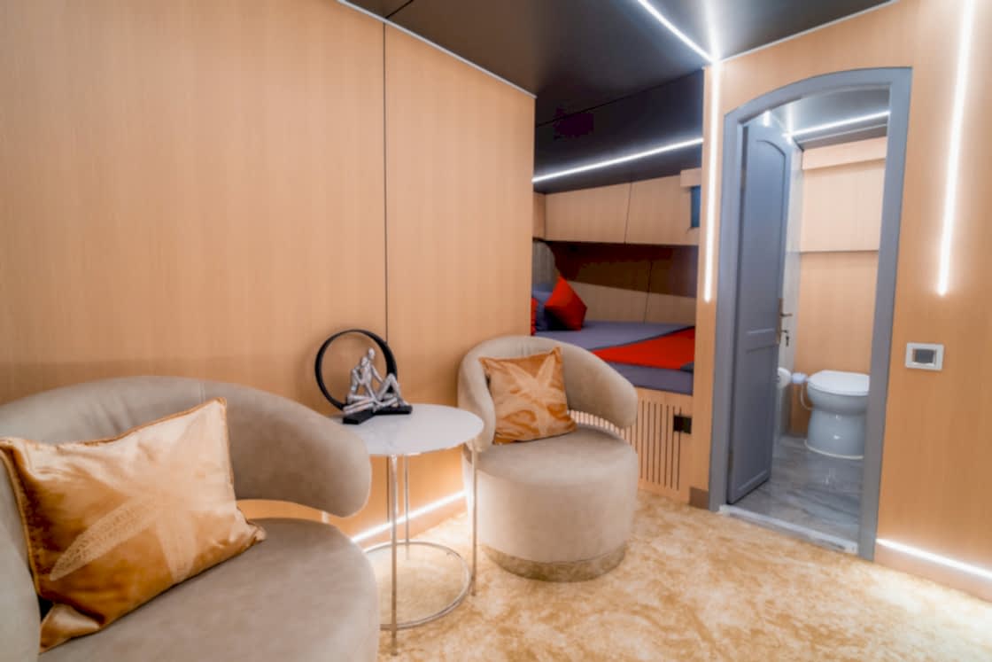 Onboard amenities include unlimited Wi-Fi, Bluetooth speakers, and a fully stocked service bar. Every detail is designed for both relaxation and entertainment on the water. For adventurous spirits, the yacht features a wide variety of water sports: ringo, waterskiing, wakeboarding, paddleboarding, canoeing, snorkeling, masks, and fins. Whether you seek thrills or tranquil fun, Princess Alize offers it all.